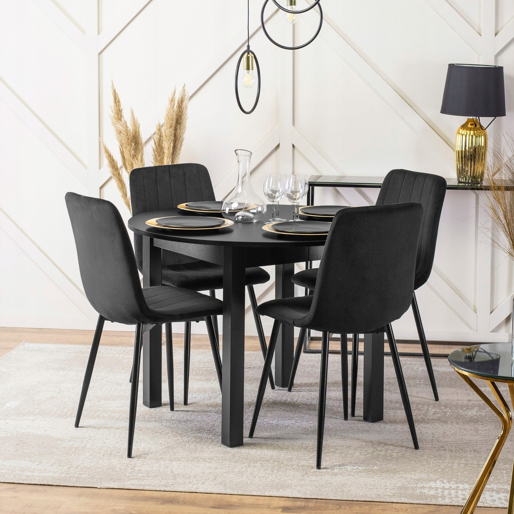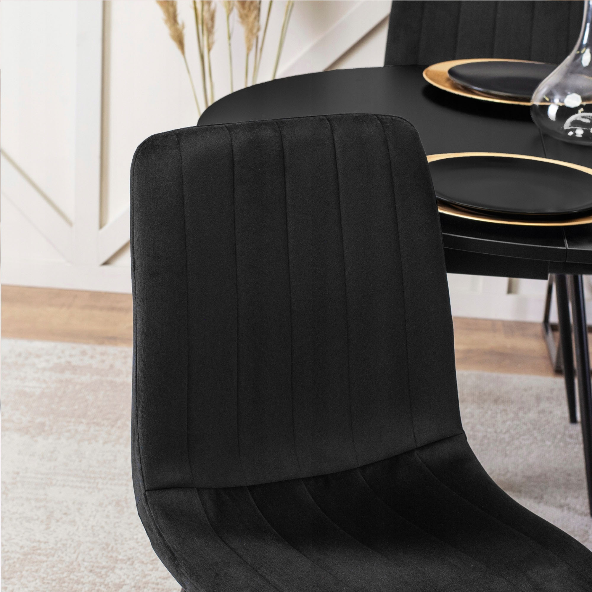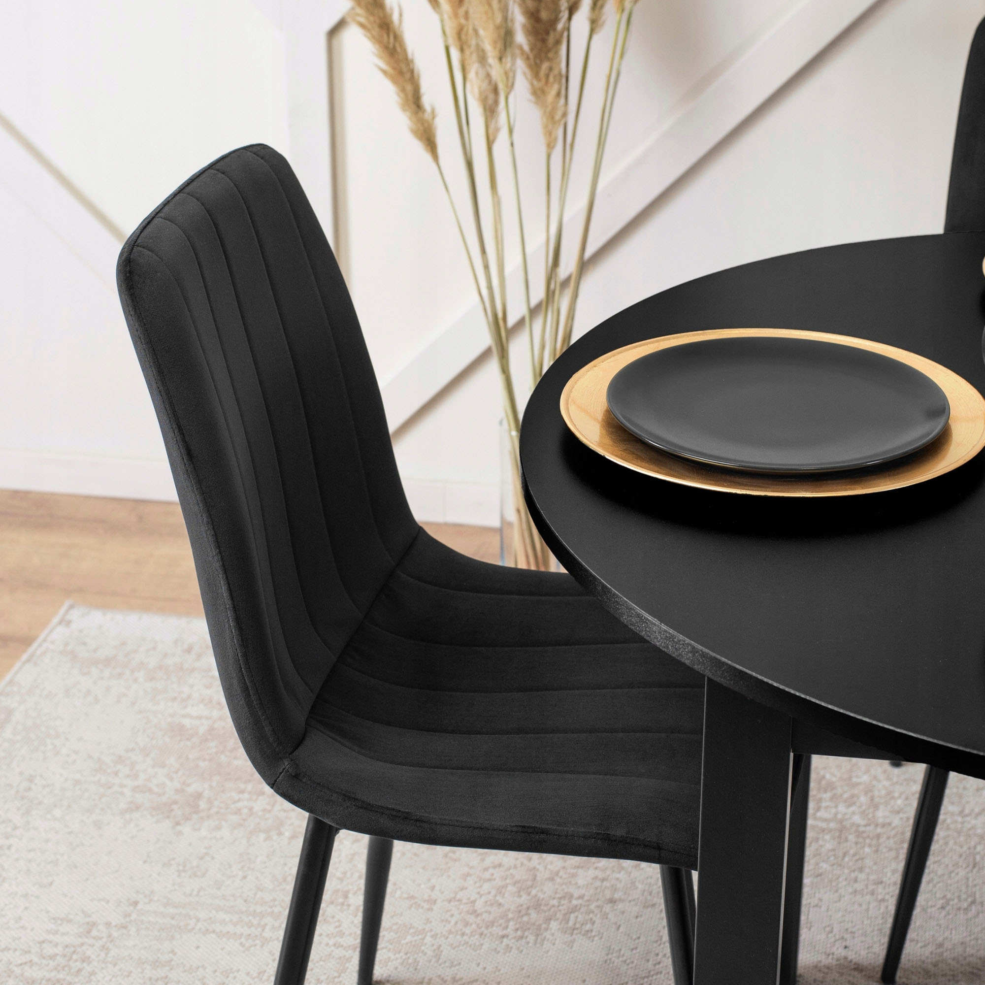 LUCCA je elegantní židle s vysokým opěradlem a měkkým čalouněním, které vám poskytne pohodlí i při delším sezení. Sametový potah v černé barvě působí luxusně, zatímco černé kovové nohy dodávají židli stabilitu a vizuální lehkost.