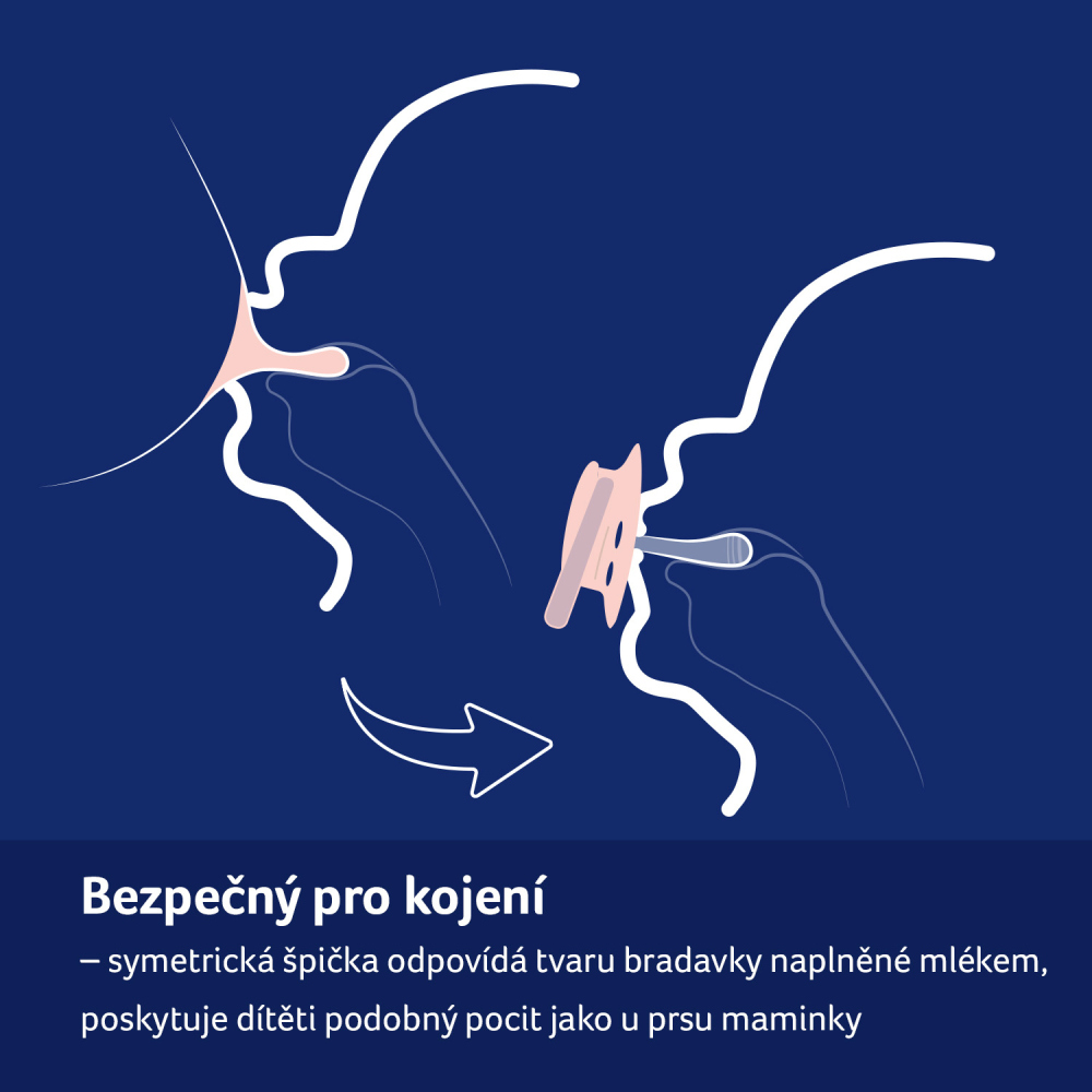 Symetrický tvar špičky vychází z tvaru bradavky naplněné mlékem, která poskytuje miminku známý pocit podobný pocitu z prsu.