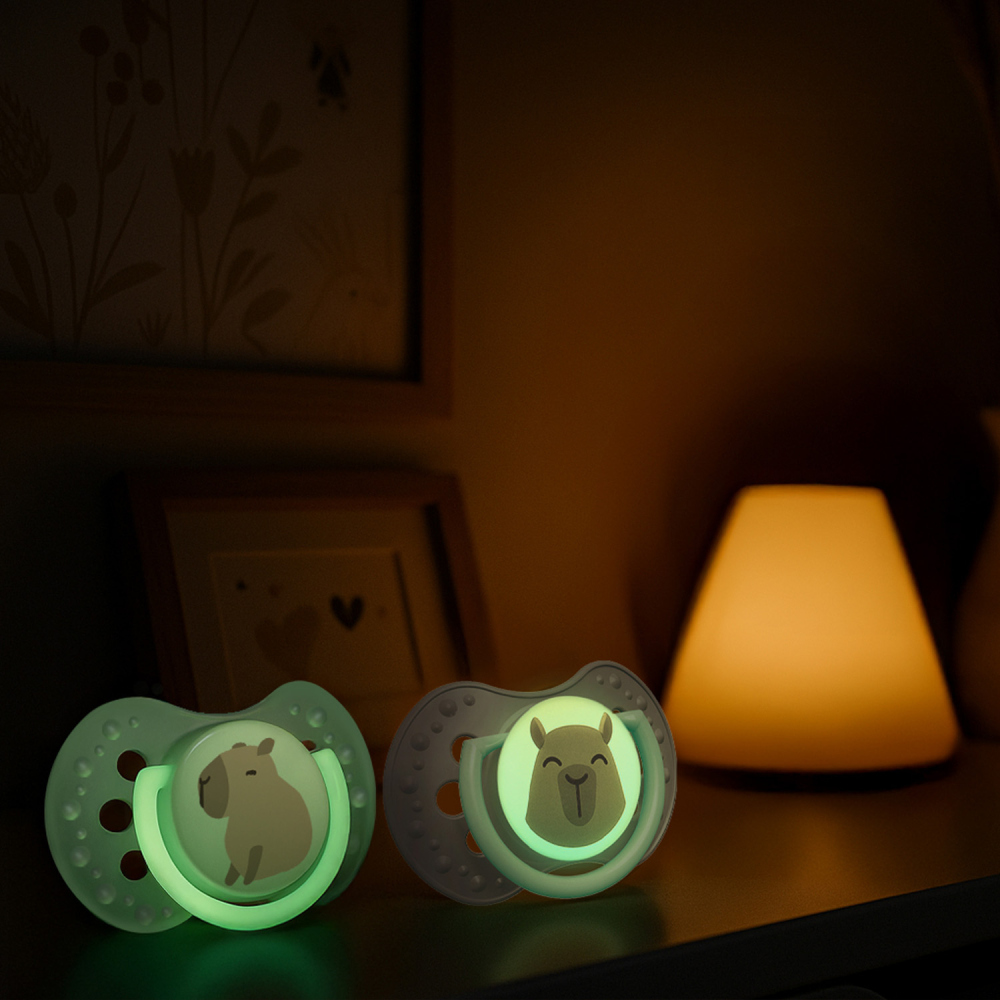 Úchytka u jednoho dudlíku a střed u druhého dudlíku svítí ve tmě, což usnadňuje jeho hledání v noci.