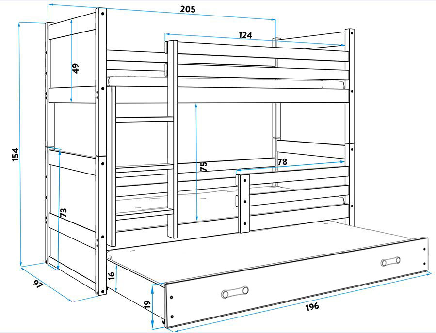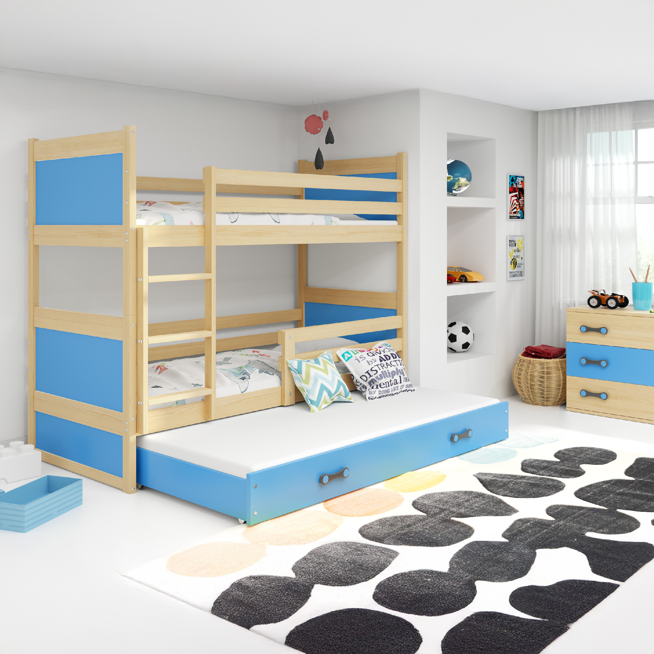 SMB Dětská patrová postel s přistýlkou RICK 4, 90x200 cm Dekor: Bílá, Barva šuplíku: Zelená