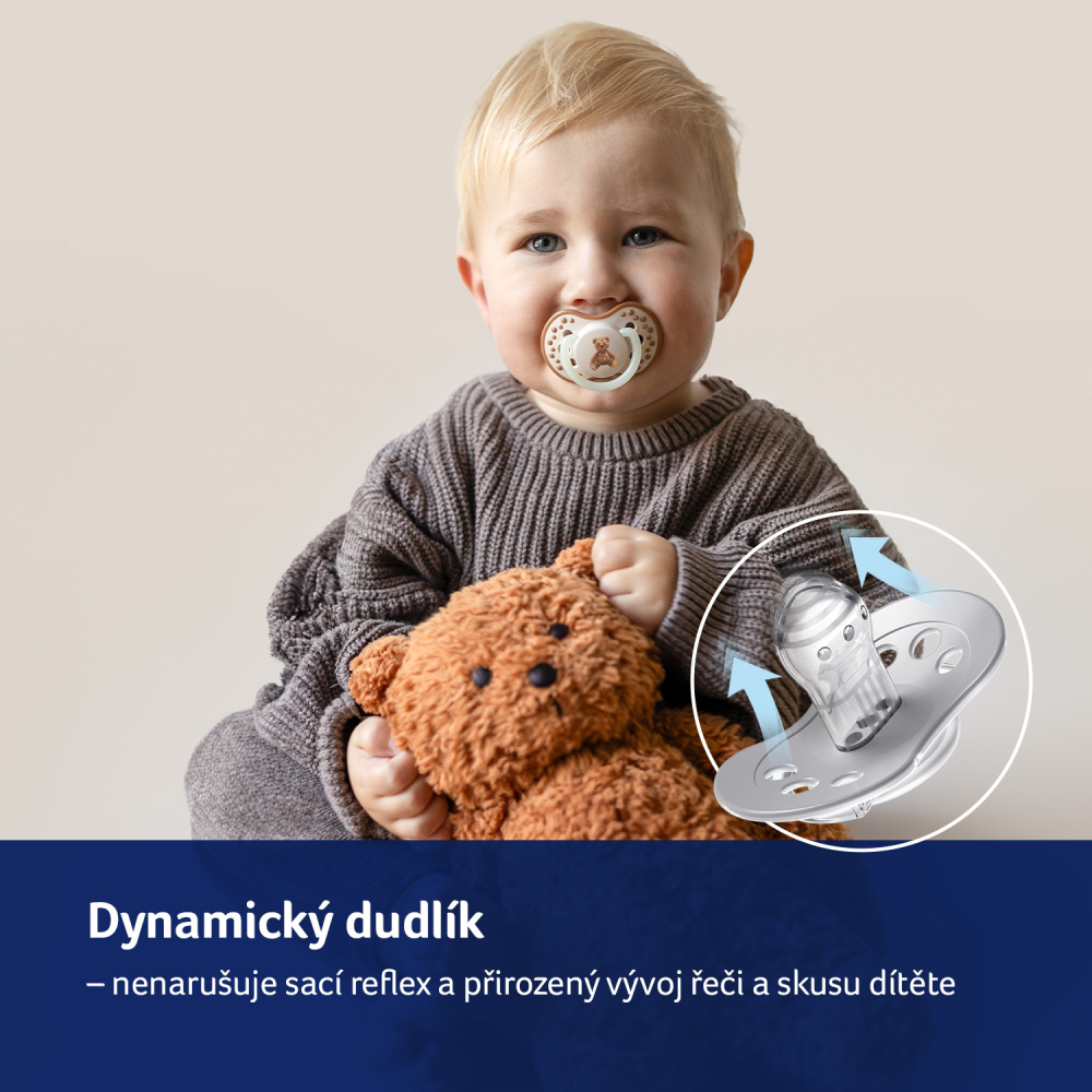Dynamický dudlík TEDDY LOVE navíc nenarušuje vývoj řeči a kousání*. Špička je zploštělá a krk je tak tenký, že umožňuje dítěti volně zavírat ústa a správně pracovat dásněmi při sání a poskytuje dostatek prostoru v ústech pro práci jazyka, což snižuje riziko malokluze a vad řeči *.