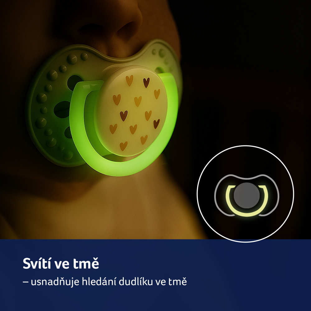 Dudlík má úchytku svítící ve tmě, což usnadňuje jeho hledání v noci.