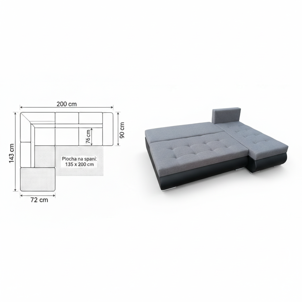200 cm (šířka) × 143 cm (hloubka) × 70 cm (výška)