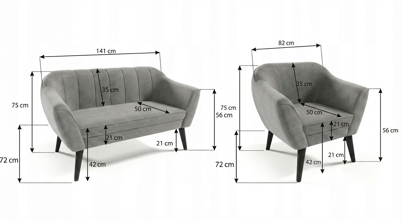 pohovka 141 cm (šířka) × 50 cm (hloubka) × 75 cm (výška)| křeslo 82 cm (šířka) x 50 cm (hloubka) x 75 cm (výška)