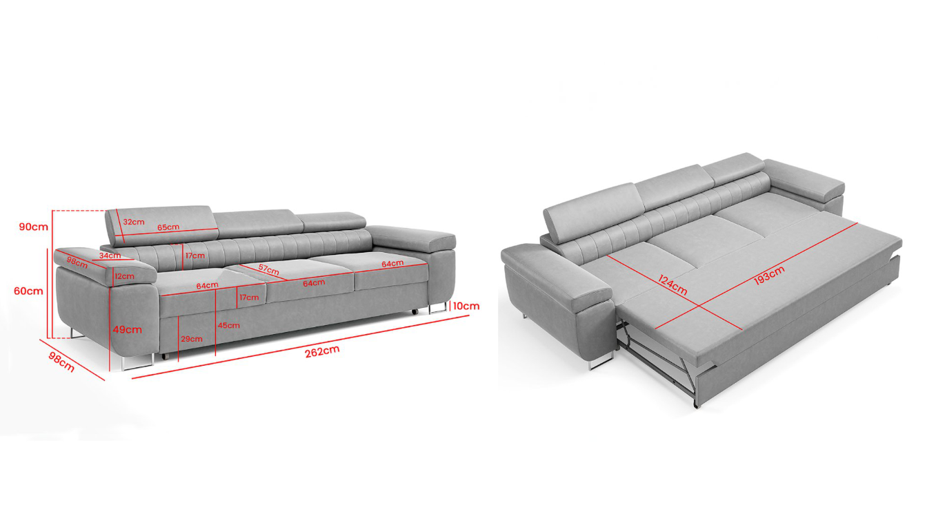 262 cm (šířka) × 98 cm (hloubka) × 90 cm (výška) | 193 x 124 cm (spací plocha)