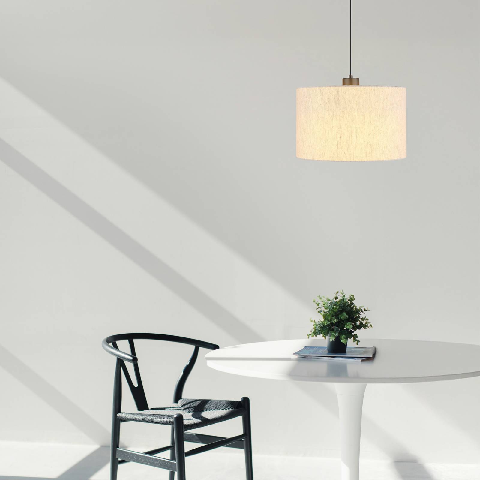 Závěsné LED světlo Thea – skandinávský design v kombinaci s teplou bílou pro stylové obytné prostory Závěsné LED světlo Thea kombinuje nadčasový skandinávský design s vysoce kvalitními materiály, jako je len a kov. Kombinace krémově zbarveného lnu a matného černého kovového povrchu vytváří harmonický vzhled, který se perfektně hodí do obývacího pokoje, jídelny nebo ložnice. Integrovaný LED světelný zdroj poskytuje teplou bílou světlo o teplotě 3 000 K, které vytváří příjemnou atmosféru a je univerzálně použitelné. Díky možnosti ovládání svítidla pomocí externího stmívače lze intenzitu světla individuálně přizpůsobit. Energeticky úsporná LED technologie zajišťuje efektivní osvětlení, které přesvědčí jak po estetické, tak po funkční stránce. LED závěsné světlo Thea je ideální volbou pro všechny, kteří kladou důraz na stylové osvětlení a promyšlený design.