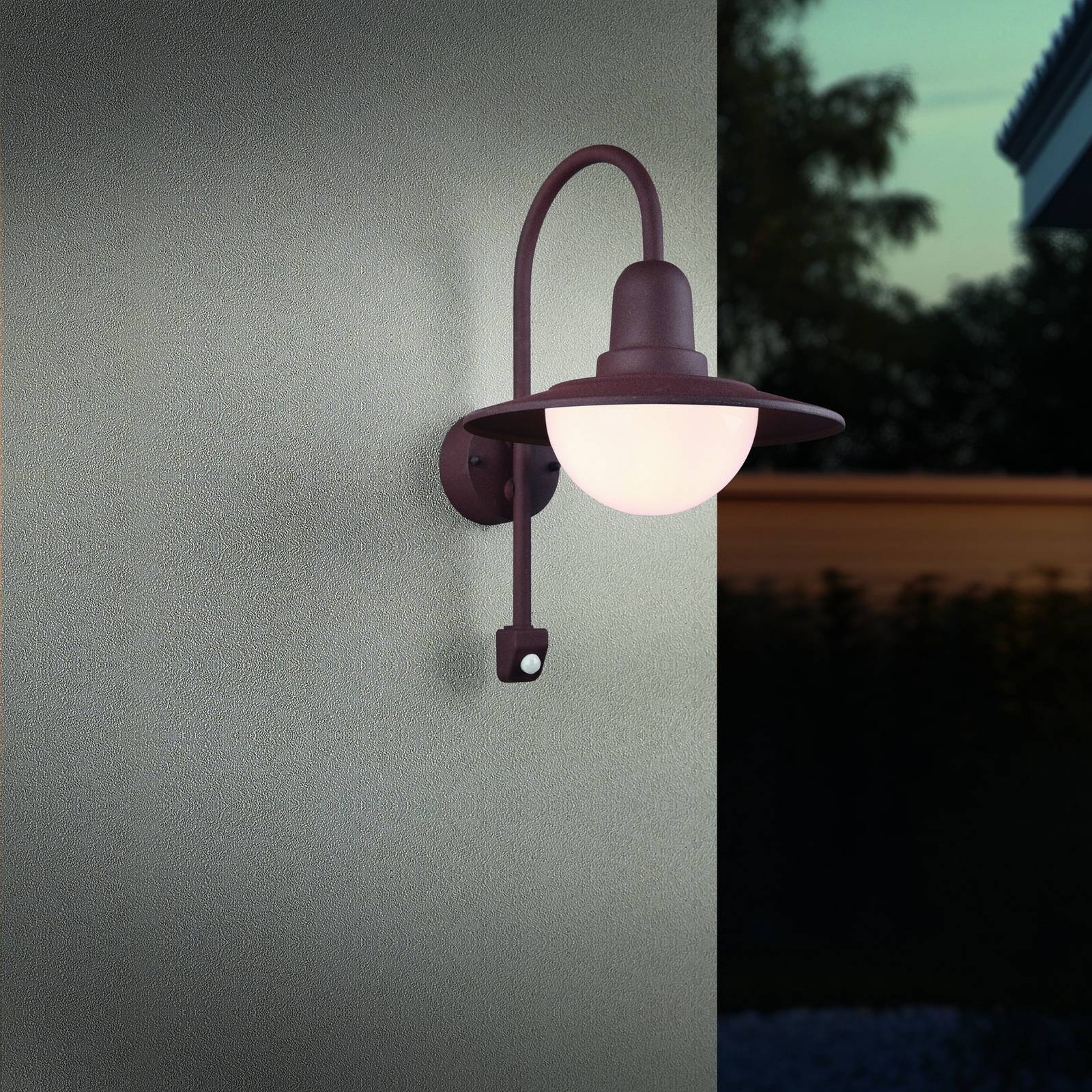 Trio Lighting Venkovní nástěnné svítidlo se senzorem NORMAN, rez, Ø 30 cm kov/sklo IP44