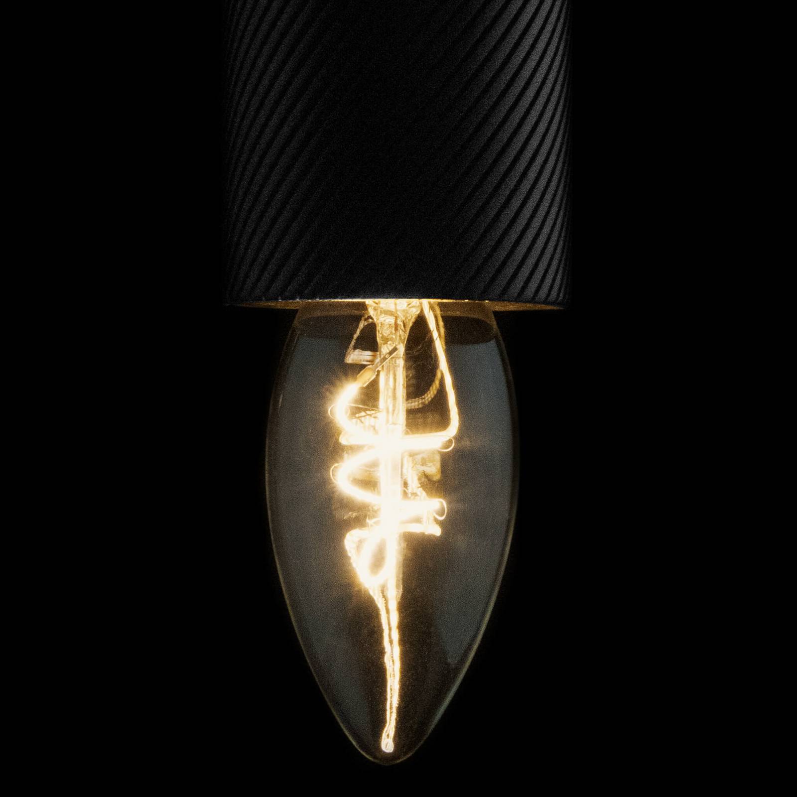 LED žárovka tvar svíčky Elegant Line E14 3W vlákno, 2 200 K, stmívatelné Tato LED žárovka tvar svíčky z řady ELEGANT Line od SEGULA vyniká zdokonaleným, tenkým a patentovaným LED vláknem, které se stále více podobá žhavicí spirále. Filigránové vlákno se elegantně vine uvnitř této žárovky z čirého skla a díky tomu je LED žárovka tvar svíčky ideální pro každé svítidlo bez stínidla. - zvláště teplá barva světla s 2 200 K - plně stmívatelné s mnoha běžně dostupnými stmívači na sestupné hraně - tenký spirálovitý vlákno s patentovanou technologií Soft Filament - energeticky účinná a úsporná