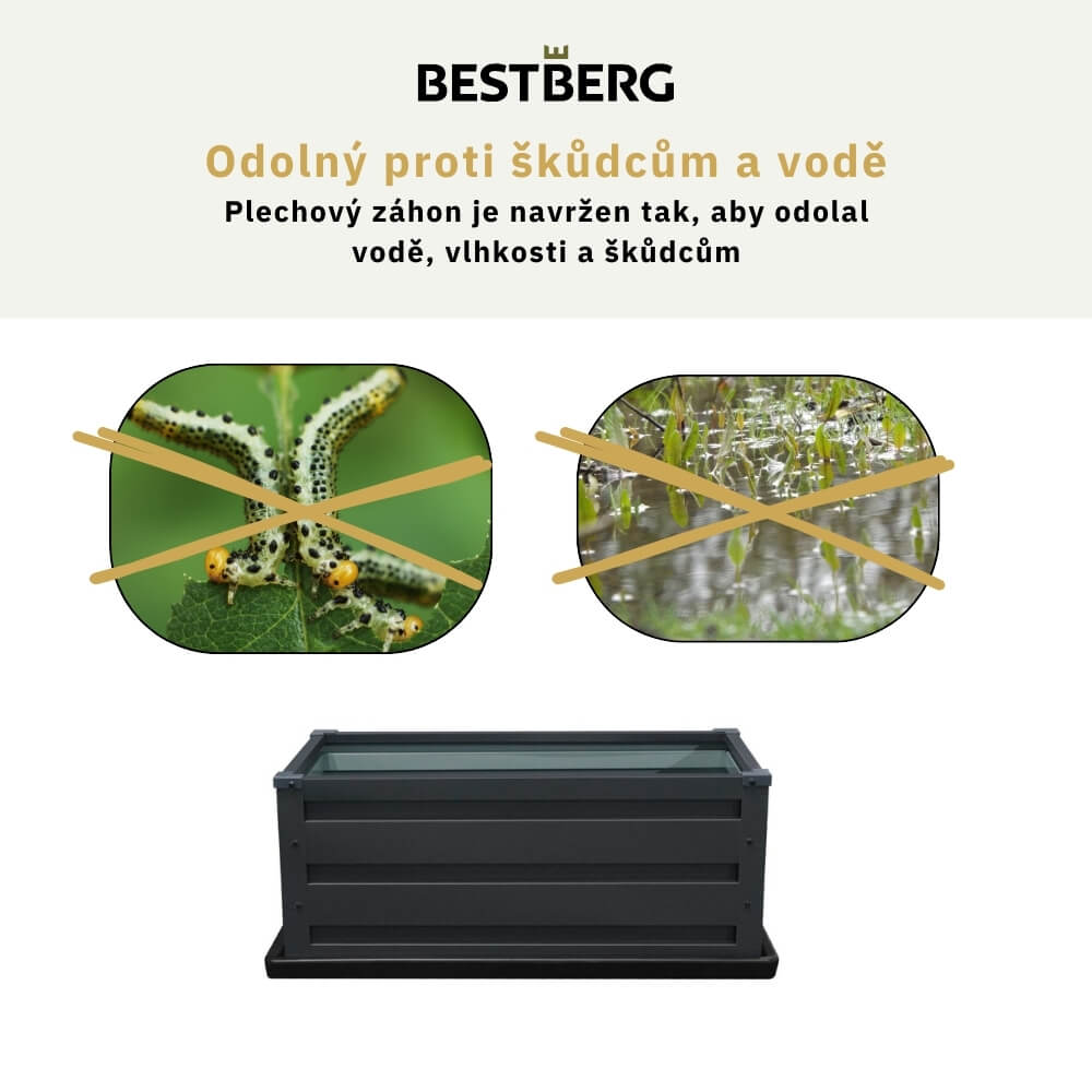 Záhon odolný proti škůdcům a voděJednou z největších výhod vyvýšeného záhonu BestBerg je jeho odolnost. Plechový materiál, ze kterého je záhon vyroben, je nejen odolný vůči vodě. Tvoří také bariéru proti škůdcům z půdy.