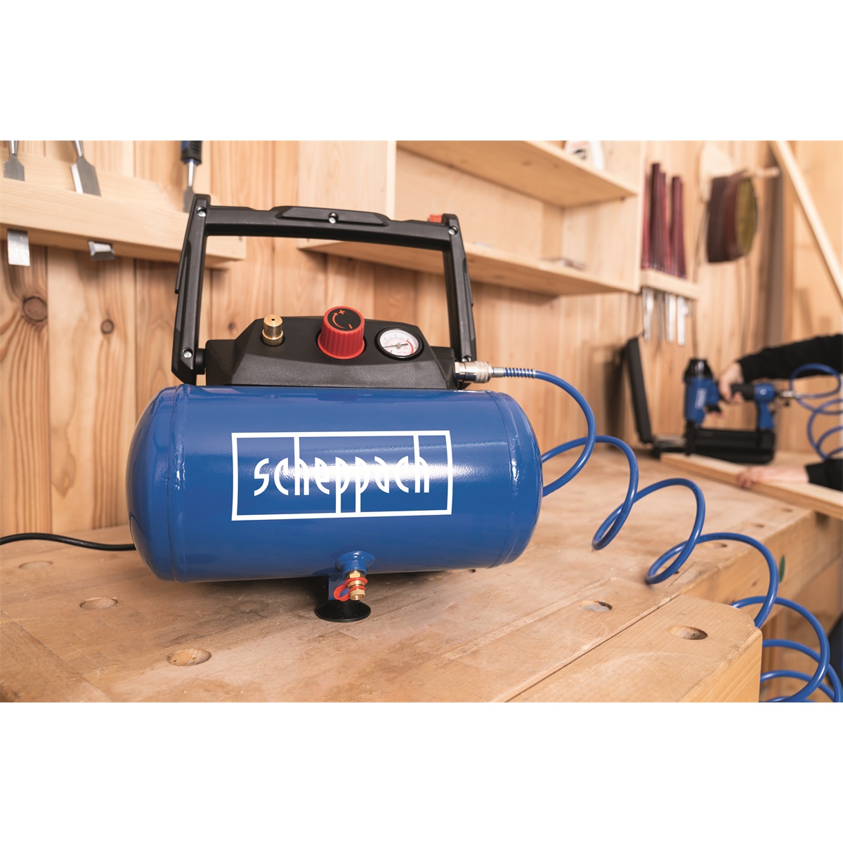 Kompresor Scheppach HC 06 je praktický, lehký a snadno přenosný kompresor s tlakovou nádobou o objemu 6 l a silným motorem 1200 W. Díky moderní bezolejové technologii má minimální nároky na údržbu. Hodí se jak do běžných domácích dílen, tak i pro řemeslníky, pro které je důležitým kritériem nízká váha, malá hmotnost a snadný transport. Díky vzdušníku se kompresor hodí nejenom na běžné nafukování pneumatik, míčů, matrací, jízdních kol, ale můžete k němu připojit i sponkovačku, stříkací pistoli (air brush), ofukovací pistoli apod. Díky bezolejové technologii je vhodný i na tlakování výčepních zařízení. Výši tlaku si jednoduše nastavíte otočným ovladačem a jednoduše kontrolujete pomocí vestavěného manometru. Stroj je vybaven velkým madlem, háky pro snadné namotání přípojného kabelu a pro dobrou stabilitu i nohami s gumovými patkami. Kompresor je už v základu vybaven bohatou sadou šestidílného příslušenství, takže ho můžete bez dalších finančních výdajů začít ihned používat. Nástroje šestidílné sady jsou vyrobeny z kvalitních slitin kovů a snadno se připojí na rychlospojku kompresoru.
