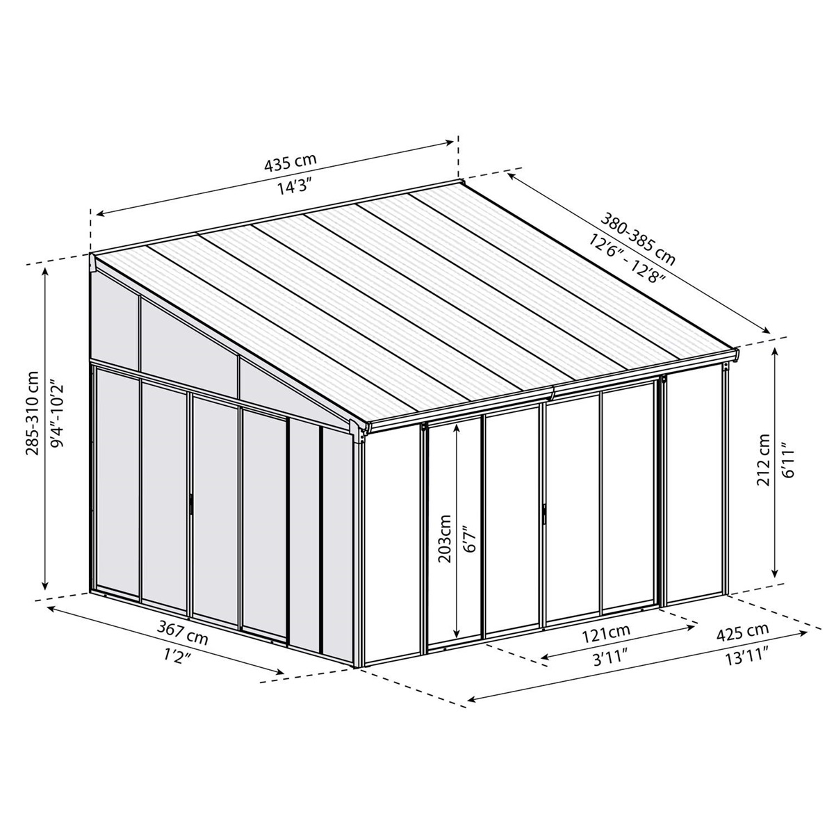 | Rozměry skleníku (D x Š x V) | 385 x 435 x 285-310 cm |