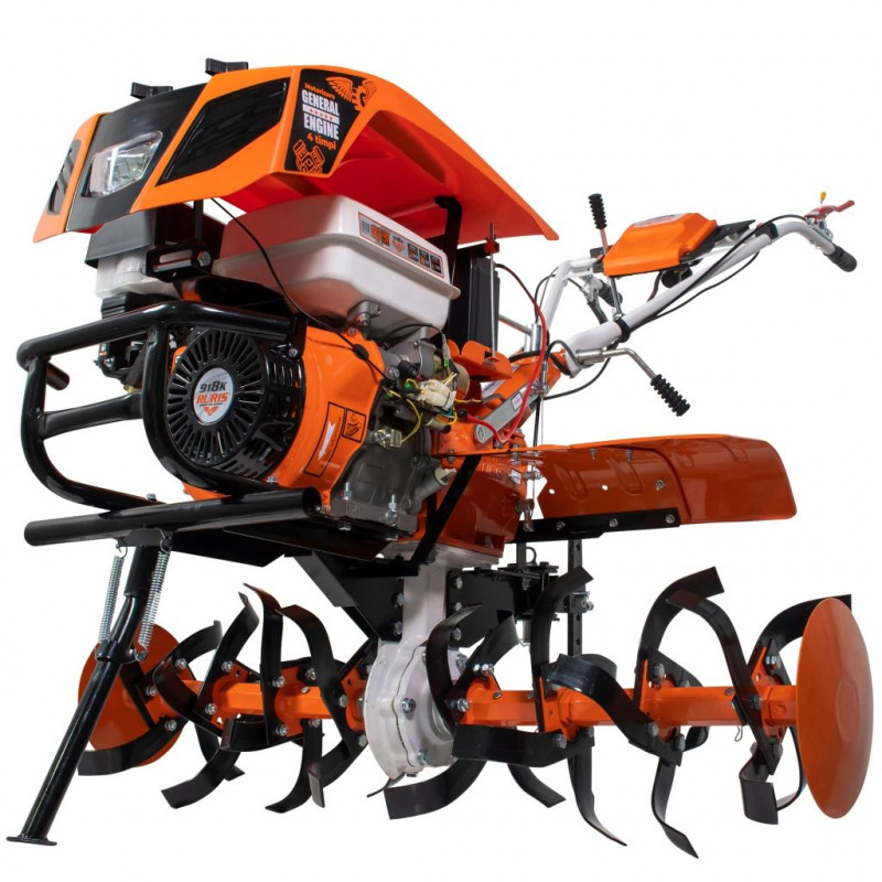 Profesionální kultivátor s elektrickým startováním na klíč. Kultivátor s motorem 18 HP General Engine a objemem válců 460 ccm dokáže bez problémů kultivovat a orat jakýkoli typ půdy bez ohledu na její tvrdost, přičemž dosahuje hloubky až 360 mm s účinností přes 1500 m2/h. Vybaven kultivačními noži s nastavitelnou šířkou od 750 mm do 1100 mm. Výkonný motor se 2 převody vpřed a zpátečkou a kuželová převodovka dělají z profesionálního kultivátoru RURIS 918K perfektní stroj na tažení přívěsu, který snadno potáhne 1000 kg náklad. Pro jednodušší startování je kultivátor vybaven systémem automatického startování klíčem. Řadicí páka je umístěna na úrovni rukou, což umožňuje snadnější volbu požadované rychlosti. Převodová skříň nevyžaduje speciální údržbu a je použitelná na všechny skupiny půd. Je vyrobena z tvárné litiny, odolná vůči nárazům a mechanickému opotřebení. Kultivátor má osvětlení, které umožňuje jeho použití i při zhoršené viditelnosti nebo po setmění. RURIS 918K umožňuje připojení širokého sortimentu příslušenství jako jsou protizávaží, jednořadličný pluh, brány, otočný pluh, vyorávač brambor, kultivátor, secí stroje, kovová nebo pryžová kola, přívěs. Unikátní konstrukce je založena na převodovém okruhu mezi převodovkou a frézou a kuželové převody pomáhají zvládnout práci na nejtvrdších površích v rekordním čase. Manévrovatelnost je dána konstrukcí naváděcího a ovládacího systému, ovládací prvky jsou umístěny ve snadném dosahu obsluhy. Snadná manipulace díky vzhůru nastavitelným kovovým madlům a gumovým rukojetím navrženým pro tlumení vibrací generovaných motorovým rypadlem. Kultivátor má osvětlení, které umožňuje jeho použití i při zhoršené viditelnosti nebo po setmění. RURIS 918K umožňuje připojení širokého sortimentu příslušenství jako jsou protizávaží, jednořadličný pluh, brány, otočný pluh, vyorávač brambor, kultivátor, secí stroje, kovová nebo pryžová kola, přívěs. Včetně pluhu na brzdu kultivátoru.