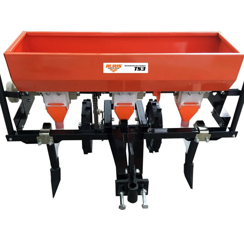 Secí stroj TS3 lze připojit ke všem kultivátorům a malotraktorům RURIS. Tento produkt je ideální volbou pro prosévání malých a středních pozemků, protože je vhodný pro travní porosty i zeleninové plodiny. Vzdálenost mezi řadami je 35 cm. Pokud chcete, aby byly řádky pěstovány ve větší vzdálenosti, můžete střední řádek odstranit, čímž se vzdálenost zvětší na 70 cm. Hnací kola jsou poháněna pomocí řetězu na blocích pro rozdělování osiva, které nechá osivo padat do brázdy připravené radličkou. Hloubka setby se nastavuje z radličky. Požadovanou vzdálenost mezi řádky lze nakreslit fixem. Výběrové pole pro požadovanou vzdálenost mezi rostlinami se vytvoří z bloku distribuce semen. Produkt má vanu na vkládání semen s možností výběru zavřením nebo otevřením dvou chlopní, takže si můžete vybrat modul odpovídající semínkům, která chcete zasít.