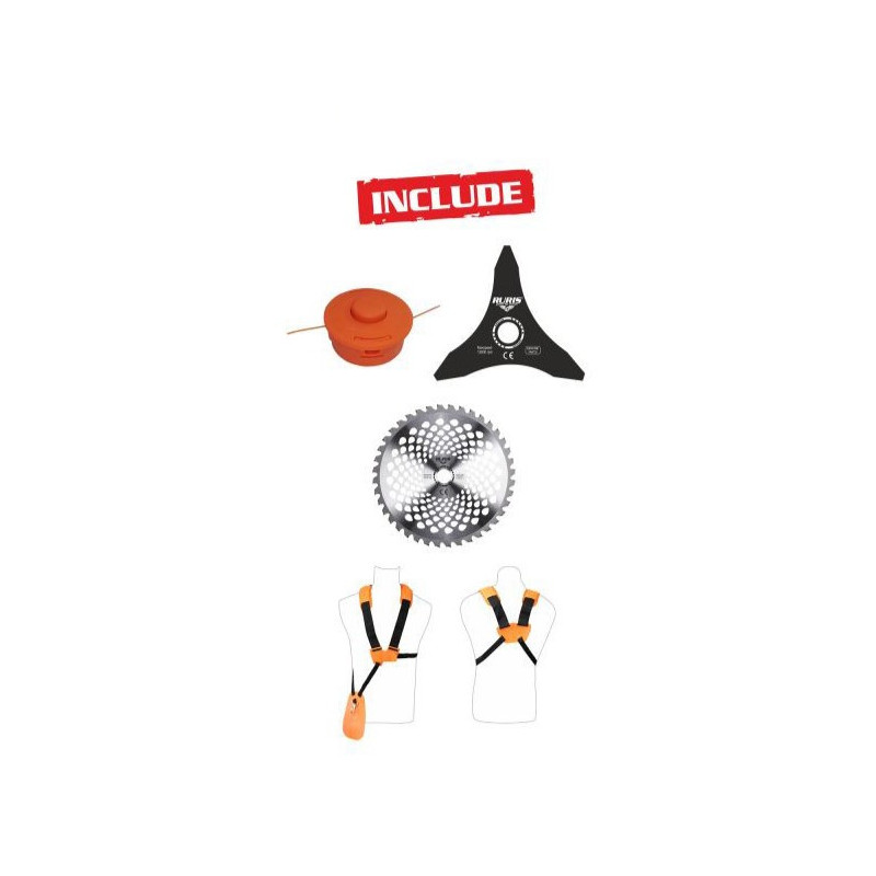 Benzínový křovinořez s elektronickým systémem zapalování, manuálním startem. Včetně dvojitého balančního postroje, vyžínací cívky, 3-zubého žacího nože a 40-zubého žacího nože.