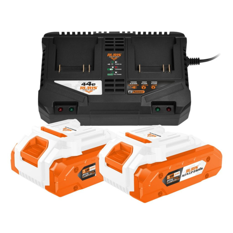 Sada dvou akumulátorů a dvojité nabíječky RURIS Alfa UP 4444e má napětí 20 V a kapacitu 4 Ah. Inovace Ruris Alfa Up umožňuje restart baterie i po delším skladování mezi 6 až 12 měsíci. Tato funkce řeší problém baterií, které se během skladování zcela vybijí a již nelze použít, je důležitá i pro ochranu akumulátoru před poškozením. Pokud se baterie během skladování zcela vybije, může se poškodit a nebude fungovat tak dobře jako dříve. S funkcí Ruris Alfa Up bude baterie vždy chráněna a připravena k použití. Technologie Alfa Up, která má schopnost prostřednictvím elektrických impulzů restartovat baterii, když je vybitá nebo skladována na dlouhé období mezi 6 - 12 měsíci.