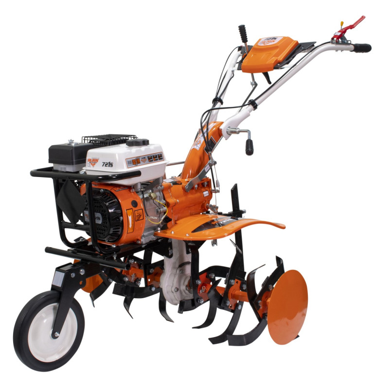 Benzínový kultivátor 721S spojuje to nejlepší z obou světů – kompaktní rozměry modelů RURIS 6500 / 7000 a sílu legendárního kultivátoru RURIS 732. Robustní litinová převodovka s ozubenými koly pracujícími v olejové lázni zaručuje dlouhou životnost a spolehlivý přenos výkonu i v náročných podmínkách. Přední přepravní kolo usnadňuje manipulaci a přesun po zahradě či dvoře. Ideální pomocník pro obrábění půdy, orbu, kypření i přípravu záhonů.