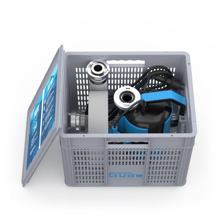 • Výkonná sada GÜDE 750, určená pro případ povodní, odvodnění zatopeného sklepa, zaplaveného staveniště ap. Robustní čerpadlo s motorem o výkonu 750 wattů dodává až 12 000 litrů za hodinu a snadno si poradí s částicemi o průměru až 22 milimetrů. Díky desetimetrové tlakové hadici a stupni krytí IPX8 je čerpadlo univerzální a zůstává spolehlivé i při úplném ponoření. Vše je dodáváno v praktickém přepravním boxu s víkem, který umožňuje rychlý přístup a zajišťuje úhledné, prostorově úsporné skladování.