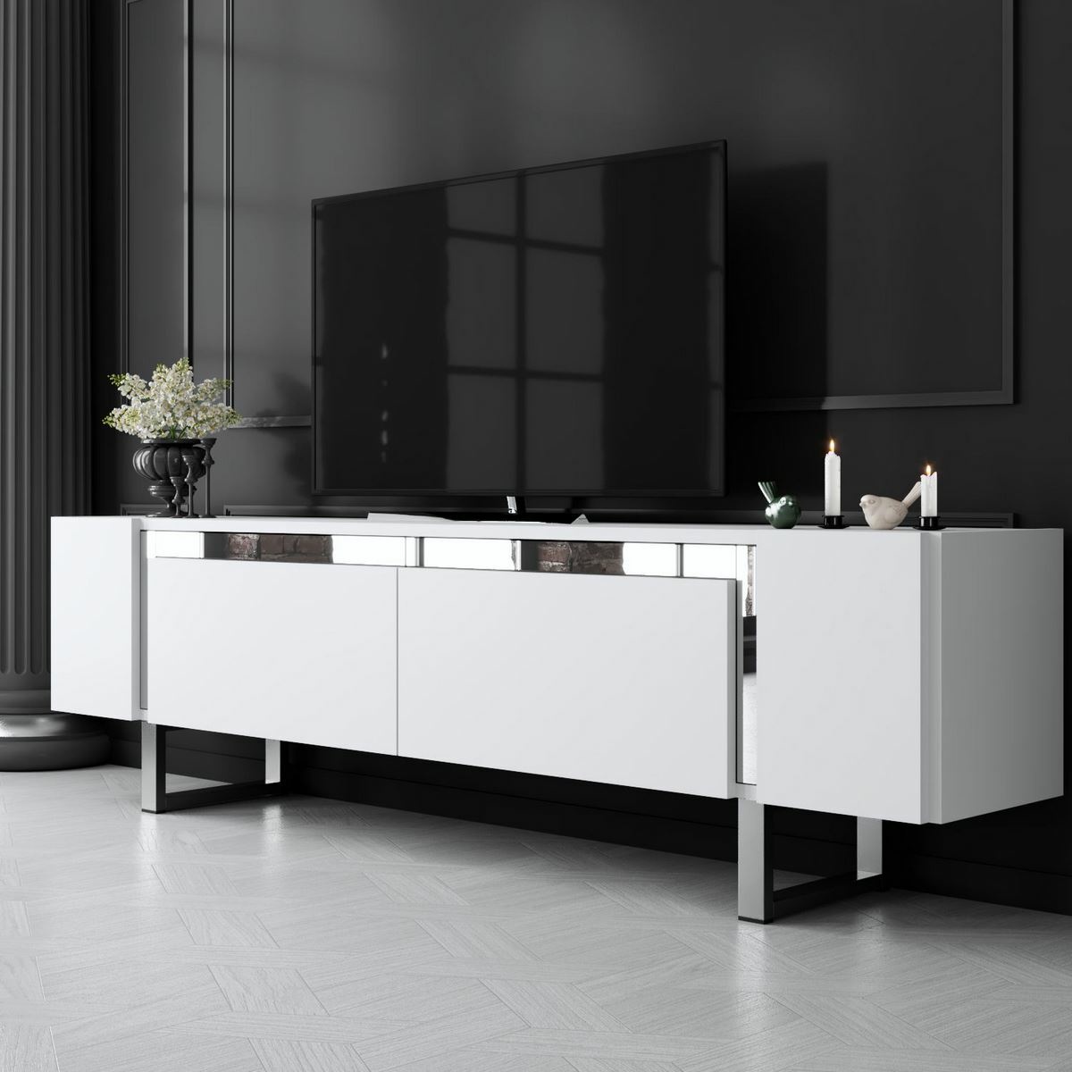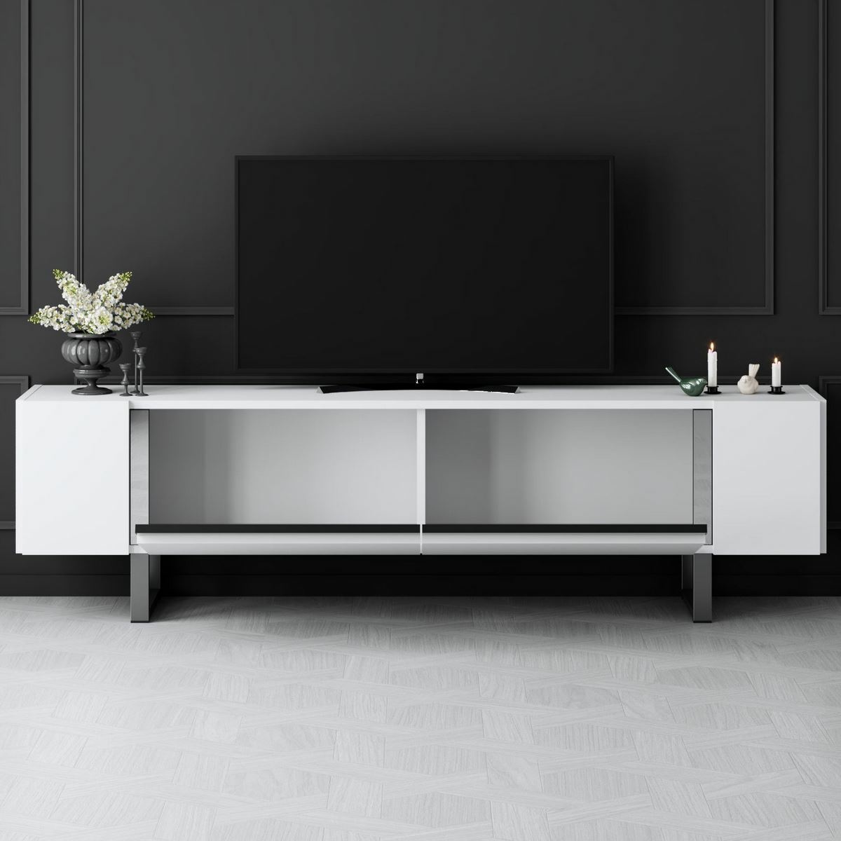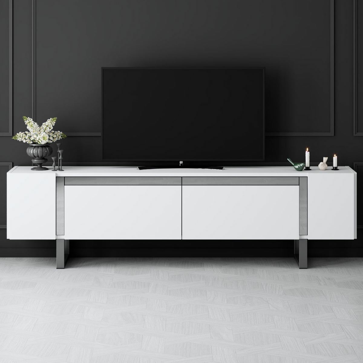 Televizní stolek Yildiz White and Silver vnese do obývacího pokoje svěží a elegantní vzhled. Kombinace bílé barvy a stříbrných detailů působí čistě a moderně, takže se stolek snadno začlení do současných i minimalisticky laděných interiérů.Korpus je vyroben ze 100% melaminem potažené dřevotřísky o tloušťce 18 mm, která zajišťuje pevnost, odolnost a dlouhou životnost. Kovové nohy ve stříbrném provedení podtrhují moderní charakter stolku a poskytují stabilní oporu. Díky šířce 180 cm nabízí dostatek prostoru pro televizor, elektroniku i další vybavení vaší zábavní zóny.Technické detaily: materiál: 100% melaminem potažená dřevotříska tloušťka desky: 18 mm nohy: kovové, profil 40 × 20 mm výška nohou: 16 cm rozměry: šířka 180 cm, výška 50 cm, hloubka 30 cm barva: bílá / stříbrná
