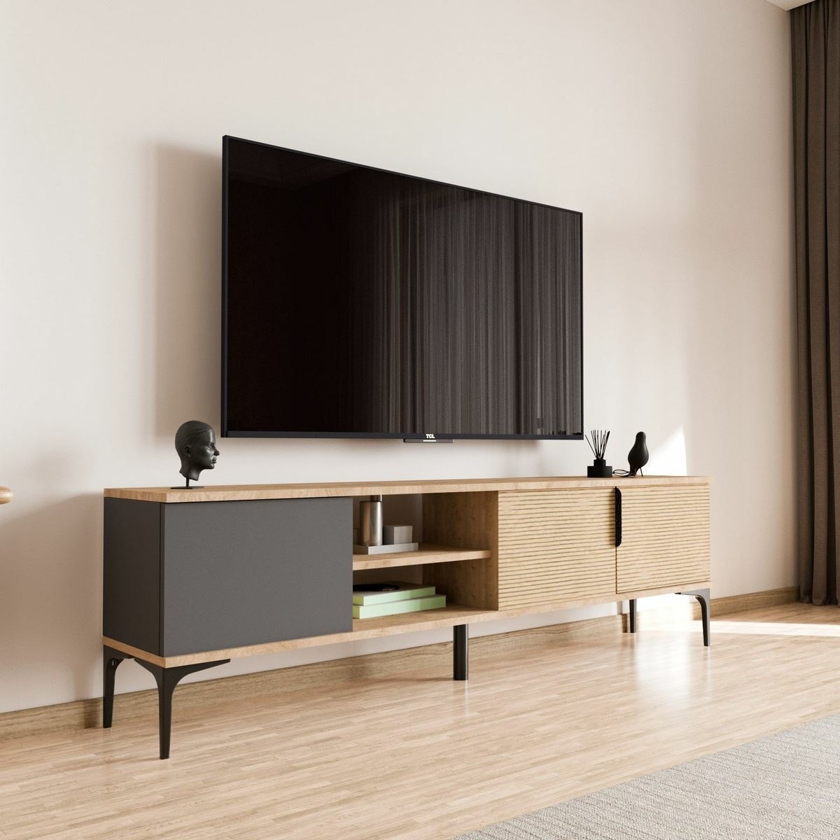 Televizní stolek Tarze Anthracite and Oak kombinuje moderní design s nadčasovou dvojicí antracitové barvy a dubového dekoru, která působí elegantně, klidně a zároveň velmi univerzálně. Díky čistým liniím a vyváženým proporcím se stolek snadno začlení do moderních, industriálních i skandinávsky laděných interiérů.Korpus je vyroben ze 100% melaminem potažené dřevotřísky, která se vyznačuje vysokou odolností, snadnou údržbou a dlouhou životností. Prakticky řešený úložný prostor s otevřenými policemi umožňuje přehledné uspořádání TV techniky, herních konzolí i dalšího příslušenství. Možnost upevnění ke stěně zvyšuje stabilitu a bezpečnost při každodenním používání.Parametry a specifikace: materiál: 100% melaminem potažená dřevotříska rozměry: šířka 180 cm, výška 49 cm, hloubka 33 cm výška nohou: 16 cm barva: antracit / dub