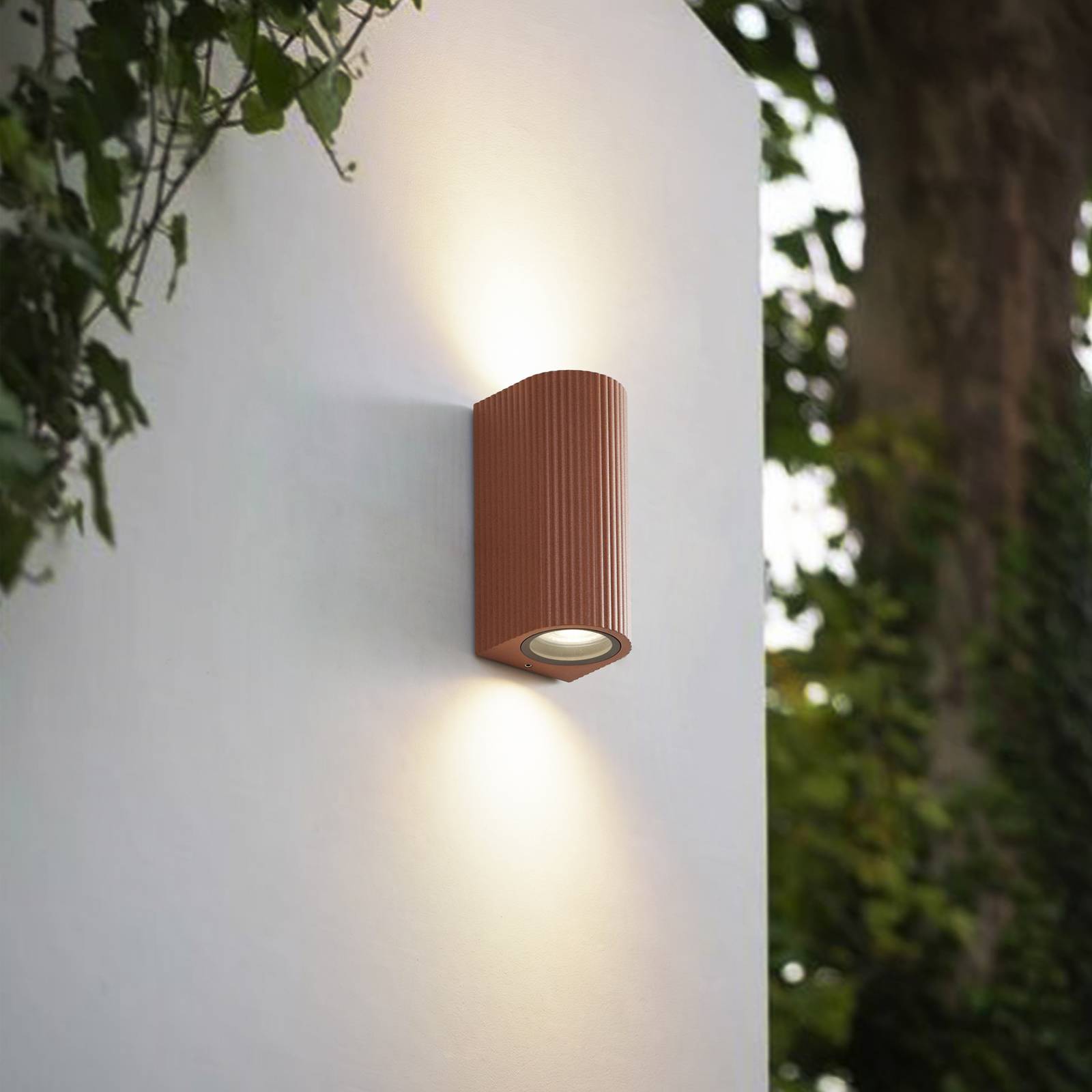 Venkovní nástěnné svítidlo Aluvo: Elegance v barvě rezavé oceli s up- a downlightem pro stylové venkovní prostory Venkovní nástěnné svítidlo Aluvo kombinuje moderní design s funkčním osvětlením. Je vyrobeno z hliníku a skla a zaujme povrchem v barvě rezavé oceli, který dodává každému venkovnímu prostoru teplou a příjemnou atmosféru. Světlo svítí nahoru i dolů, čímž dosahuje efektního rozložení světla, které stylově zvýrazňuje fasády a venkovní stěny. Díky IP kódu IP65 je optimálně chráněno proti prachu a stříkající vodě, což je ideální pro použití na balkonech a terasách. Možnost stmívání z externího zdroje nabízí další flexibilitu pro individuální přizpůsobení intenzity světla.