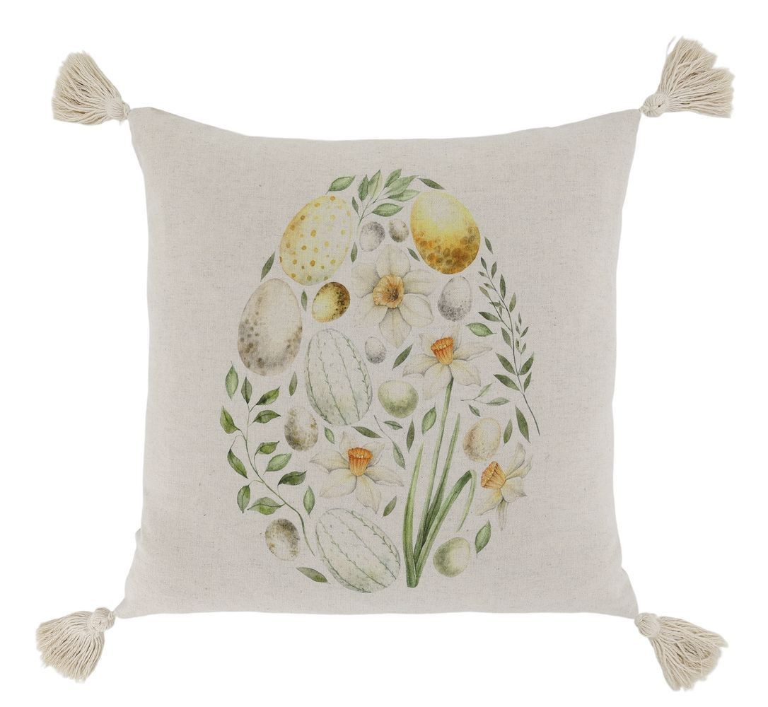 Přivítejte jaro s béžovým povlakem Aix. Motiv velikonočního vejce složený z kraslic a narcisů, zdobený střapci. Rozměr 50x50 cm. Bavlna, praní na 30 °C.