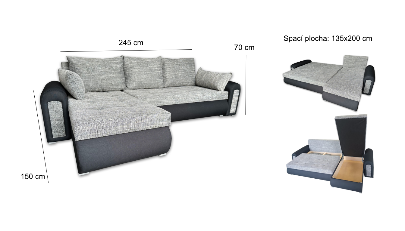 245 cm (šířka) × 150 cm (hloubka) × 70 cm (výška) | 135 x 200 cm (spací plocha)