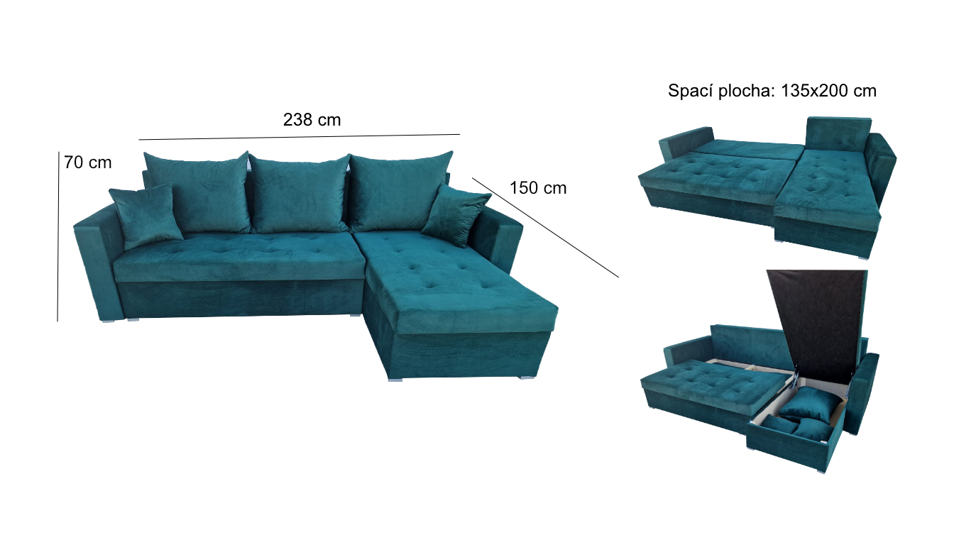 238 cm (šířka) × 150 cm (hloubka) × 70 cm (výška) | 135 x 200 cm (spací plocha)