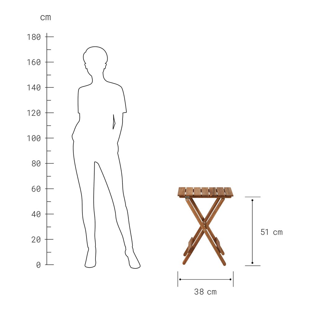 Rozměry: D 38 x Š 29,5 x V 51 cm Materiál: akáciové dřevo s certifikátem FSC, lakované Nosnost: 20 kg Pokyny pro údržbu: pravidelně čistěte a olejujte. V zimě uchovávejte v suchu v interiéru, nebo zakryjte nepromokavou plachtou. Pokud nábytek necháváte venku, tak po dešti nebo sněžení odstraňte vlhkost z povrchů, aby nedošlo ke kondenzaci a zajistila se cirkulace vzduchu. Výrobek je dodáván ve smontovaném stavu a lze jej složit. Tato praktická a pohodlná kolekce LODGE je ideálním řešením pro malé balkony.…